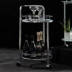 2 Tier Tea Wine Drinks Trolley On Wheels, 79cm Metal Mini Bar Cart With Tempered Glass Shelves