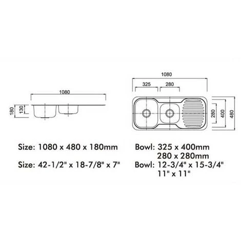 One and three quarter bowl inset kitchen sink with reversible drainer – Stainless steel 0.8mm thickness. High quality stainless steel that will not rust – Fitted with high density sound deadening pads for quieter performance – In a stunning polished finish – Can be fitted with drainer on the left or right – Holes are pre-punched and we do supply blanking discs to cover the unused ones – Includes chrome strainer wastes, over flow and fastening clips – See technical drawing for measurements