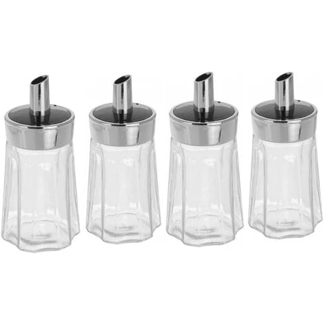 These sugar dispensers have a glass container and a silver durable plastic lid. The spout is also made of plastic. Due to its material, it lasts longer.