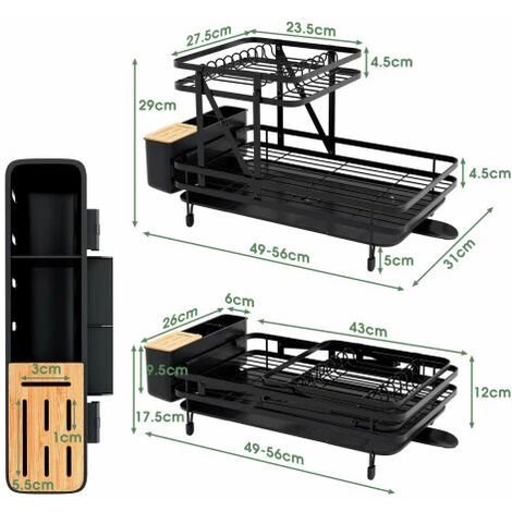 Foldable Dish Drying Rack: Designed with unique folding structure, this dish drying rack can be folded up to 1 tier or unfolded into 2 tier to fulfill your requirement. Its folded dimension is 49-56 x 31 x 17cm(L x W x H), while its unfolded dimension is 49-56 x 31 x 29cm(L x W x H).