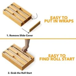 ORGANIZED AND BEAUTIFUL – Make your kitchen storage neat and organized with this bamboo wrap organizer dispenser holder box. The aluminum foil organizer is designed for your different wraps kitchen storage organization accessories; SIZE:14″ L x 8.5″ W x 3″ H