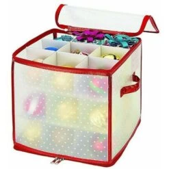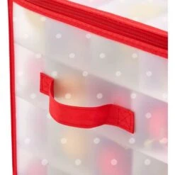 Stores up to 27 of your special ornaments in perfect condition year after year. This red and green holiday storage box is festive and strong.
