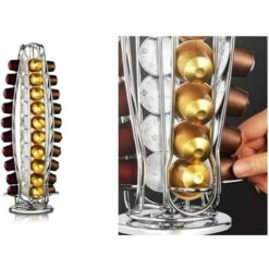Four wired holders store up to 40 Nespresso coffee capsules. Rotates 360 degrees for easy access. The felt and scratch-resistant base protects the table or the kitchen top.