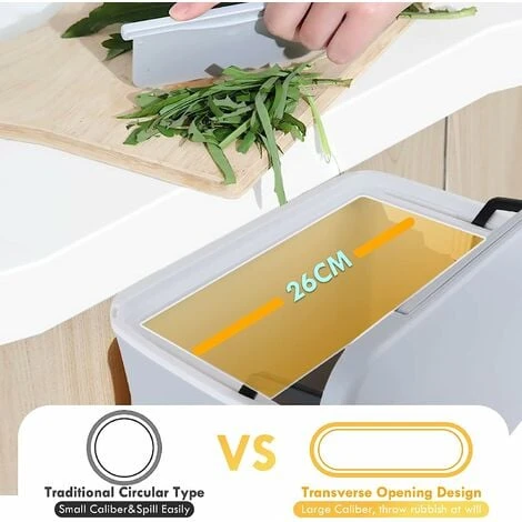 Smooth Sliding Lid – Lid is designed with tow open way to meet different needs : flip upand slide down, easy to open&hands-free, come with scraper makes clear kitchen waste and cleaning countertop a breeze, great for peels, scraps, leftovers.