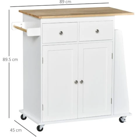 This simple style of this kitchen island, from HOMCOM, makes it an easy way to bring storage into your home. It features two smooth-glide drawers, a large bottom cupboard, a towel rail and three spice rack shelves – plenty of space to keep everything stored and organised. The main structure is crafted from a blend of MDF and particle board, making it extra sturdy. A thick varnished rubberwood panel is placed on the top, giving you extra space to prepare food if needed. It’s finished with four wheels for easy movementtwo of which can be locked to keep it in its place.