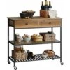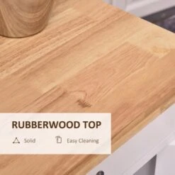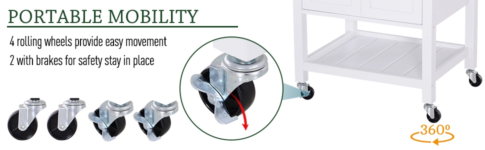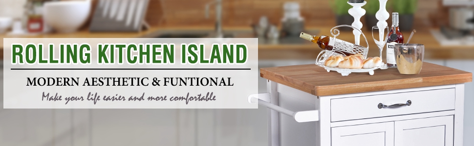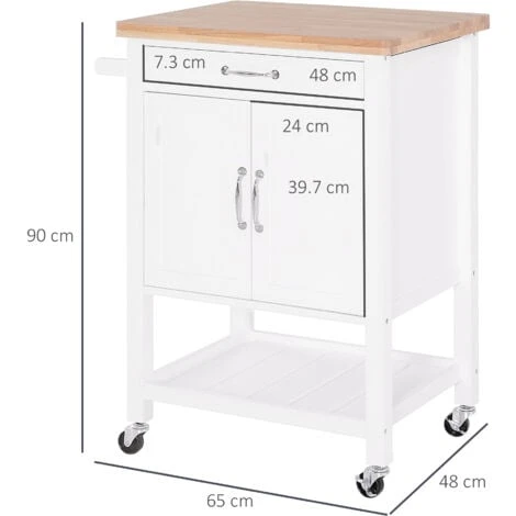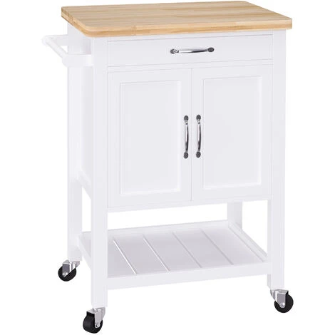 This versatile rolling serving trolley from HOMCOM is a perfect addition to your home. Features white MDF body with rubber wood worktop, it’s designed for durable long term use. With 1 worktop, 1 drawer, 1 cupboard, 1 storage shelf and 1 towel rail, this wood kitchen island offers lots of storage space for various utensils.It can be used as a storage center for dining room, garage, or the bedroom. Add a modern touch to your living space with this classic rolling veg trolley!