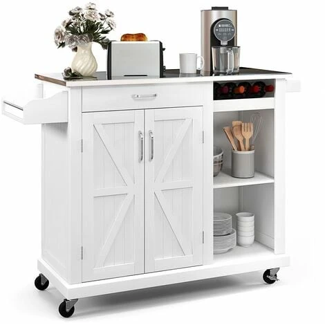 With 4 universal wheels, this kitchen island allows you to move it to the desired place without hassle. And then, lock 2 wheels to keep it in position. After that, the large countertop, spice rack, towel rack, drawer, wine storage shelf, 2-tier open compartment and 2-layer storage cabinet can’t wait to provide you with large storage space, making your items well organized. Likewise, storage shelf inside the door cabinet can be adjusted into 3 different heights for your different storage needs. What’s more, the countertop is made of premium stainless steel that is stable to hold small home appliances while allowing you to clean it with ease.