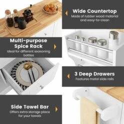 Our large kitchen island cart will be your ideal kicthen helper for food preparing and serving. It’s designed with 1 rubber wood countertop, 1 multi-purpose spice rack, 1 side towel bar, 2 enclosed cabinet with adjustable shelves and 3 deep drawers for enough storage space. Besides, you can freely adjust the 5-level shelf behind the door to keep different sized items well organized. Different from others with normal appearance and hard-to-move design, our kitchen island cart features attractive kitchen island look and 5 easy-to-move casters. What’s more, this kitchen island has metal slide rails, hydraulic hinges and exquisite door knobs for convenient opening or closing the door or drawer.