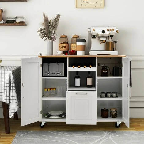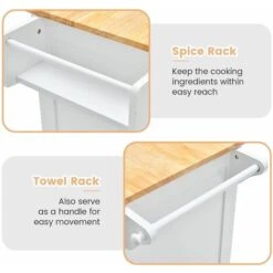 Do you want a kitchen cart to offer more storage space? Our rolling kitchen island cart will be a great kitchen helper. With drop-leaf rubber wood countertop, you will acquire additional storage space when unfolding the top area. And you can easily fold the countertop if needed. Besides, it has 2 door cabinets, 1 pull-out drawer, 1 wine rack, 1 open storage rack, 1 towel bar and 1 spice rack to fulfill your storage requirement. Meanwhile, equipped with 4 anti-slip and silent rolling casters (including 2 lockable casters), our kitchen cart is easy to move and can be firmly fixed in position. Plus, you are allowed to remove all wheels to turn it into a standing wine cabinet.