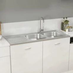 This kitchen sink with double basins and drainer set is a timeless addition to your existing kitchen decor.
