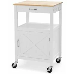 This kitchen cart features a smooth countertop, a drawer, an open shelf, a cabinet and side hooks. These ample storage spaces enable you to organize and store kitchen utensils, spices, tableware, towels, and more. The rubber wood countertop is sturdy and without burrs. The drawer with smooth drawer slides makes it easy to open and close. With handles and a magnetic catch, this storage cart is easy to use. Designed with universal wheels and a lockable design, this rolling kitchen island can wheel around smoothly and keep still when needed. It is a great addition to your home, serving as a kitchen island cart, a coffee bar, a serving cart, etc.