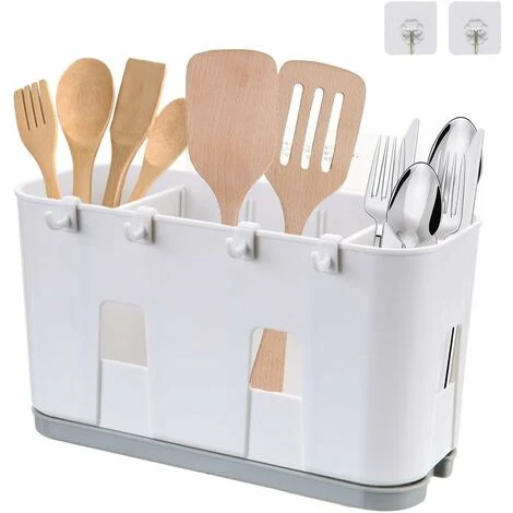 Material and Size: Our utensil holder is made of high quality ABS, which is durable . The dish rack is about 8.7*3.9*4.7 inch / 22*10*12 cm. Colour: white with gray drip tray. Contents: 1 kitchen drainer (with 2 self-adhesive hooks).