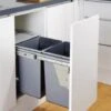 The housing of the rubbish and recycling bin is made of stainless steel and has a floor-protecting plastic base. Three removable plastic buckets with 15 litres of volume each can accommodate regular waste, organic waste, and recycling. The inserts can be quickly emptied separately from each other via a practical carrying handle.