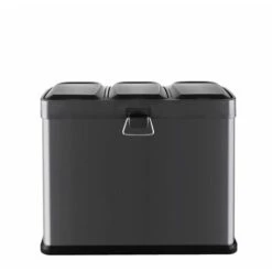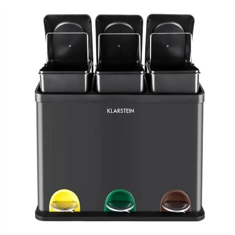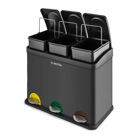 The Klarstein Ökosystem waste bin is not just one, but three containers for sorting rubbish – so waste separation is really fun. In the interior of the 45 litre waste bin, 3 stable bins are waiting to take in waste: coloured in yellow, green and brown, it is easy for even non-professional waste disposal companies to recognise which bin is which: recycled material for the yellow bin, compostable for the organic waste bin and then the rest. Super-quiet pedal mechanisms allow for the noise-free operation of the waste business. Using the chrome-plated metal handles, each bucket may be removed individually as soon as it reaches its maximum level and requires emptying. The outer housing is made of stainless steel for a uniform image and additional stability. The handle on the back side makes it easy to move the sorting specialist.