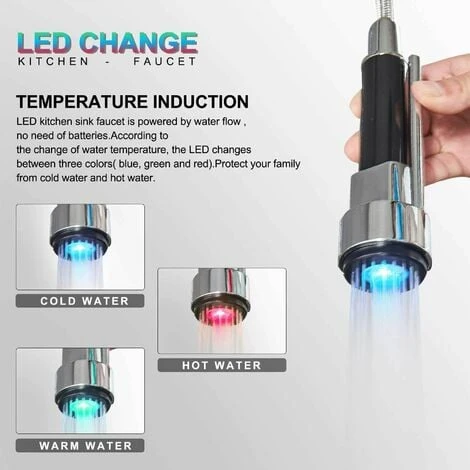 💧LED AND COLOR: LED works without battery through the water flow. The colour of the LED lights of the kitchen tap changes with the water temperature (red: hot water, blue: warm water, green: cold water). The new faucet design protects family members