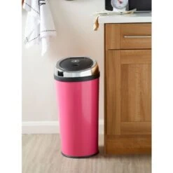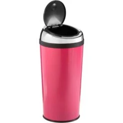 - Stainless steel bin with hot pink enamel finish ensuring durability.