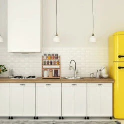 With the large spice rack, you always have your spices, oil bottles, tea tins and other kitchen utensils within reach when cooking. The shelves of the practical spice rack can be adjusted in height so that you can use the space individually. Simply place the kitchen organiser on the worktop or in the kitchen cupboard. The table shelf made of bamboo impresses with its natural look. The shelf can also be used as a table organiser at the desk.
