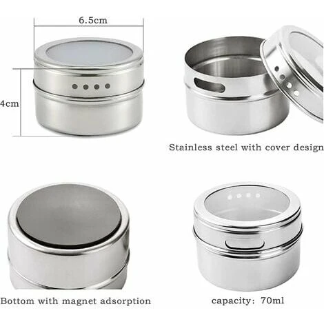 Perfectly designed tin can with transparent lid, easy to identify contents, sieve and drain design. Each stainless steel seasoning pot can be rotated flexibly and has two different holes: four small holes and one large hole. You can pour a lot of seasonings from one large hole, or you can use four small holes to gradually shake the seasonings. Two different holes can meet your different needs. May be equal.