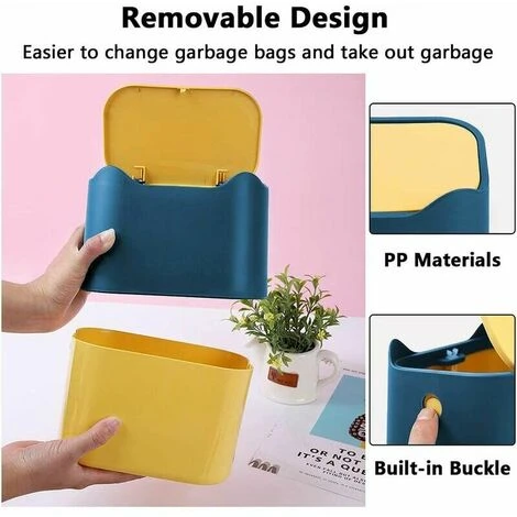 - Built-in Buckle, Double Lid: The desktop trash can has a built-in lid and buckle that allows you to secure the garbage bag and the trash can to effectively prevent them from falling while moving . The built-in bucket can also hide garbage bags better, making the office safer, nicer and cleaner. Table trash can cosmetic trash