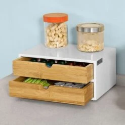 This box with 2 drawers is ideal for storing all types of coffee capsules or tea bags. In addition, it offers a practical storage space for the coffee, tea or cups. With this box, you create order and also save space.