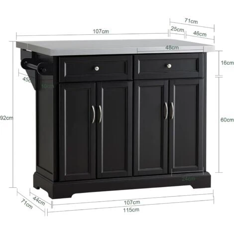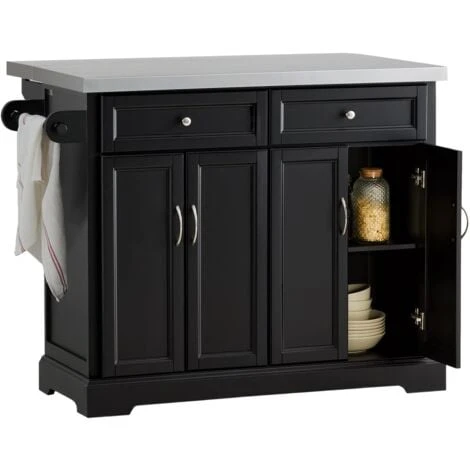- This Trolley Kitchen Island has a stainless steel worktop with widened board, 2 drawers, 2 cupboards with internal adjustable shelf, 1 towel rack and 4 wheels.