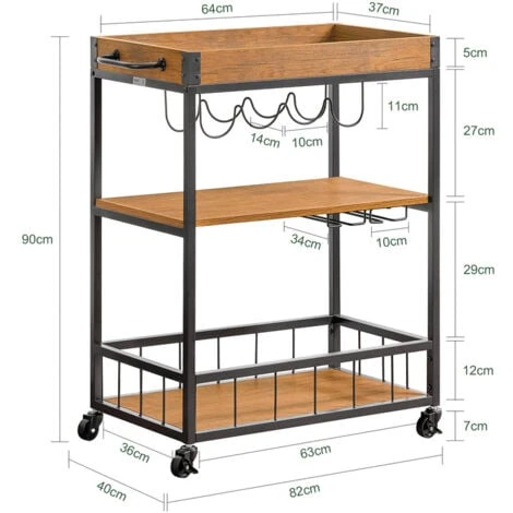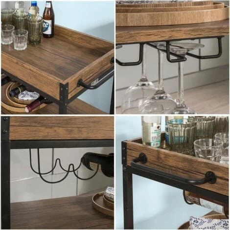 - This stylish industrial vintage serving trolley features wine rack and hanging glass storage. Holds 4 wine bottles and 6 wine glasses.