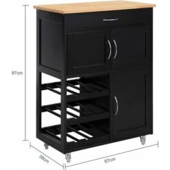 - It has 1 drawer, 2 storage cupboards, 3 wine bottle racks and 4 wheels (2 with brake).